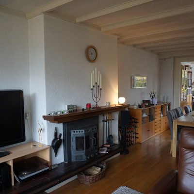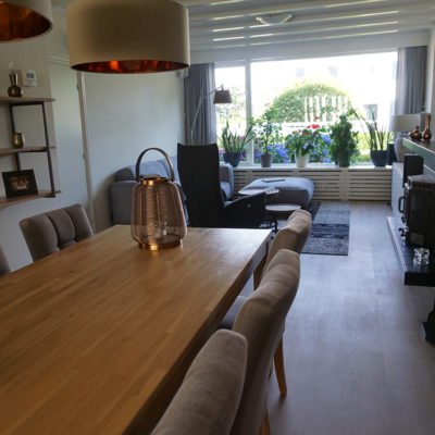 De stijl mag niet strak zijn, maar modern landelijk en gezellig. Het moet een leefruimte blijven en geen showroom. Een doorn in het oog is de kachel met stenen/stalen ombouw. Deze is heel belangrijk voor hen en willen ze graag behouden. Maar het geheel is niet meer van deze tijd.