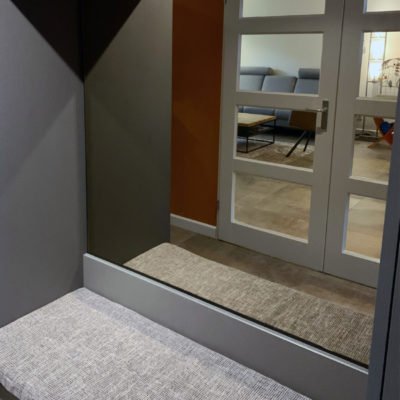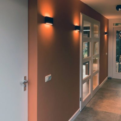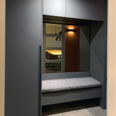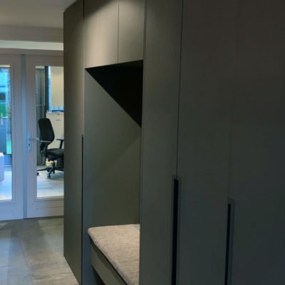 Er is gekozen voor een maatwerkkast over de volledige wand tegenover de deur naar de woonkamer. Precies in het midden van deze kast, recht tegenover de deuropening, is een zitbank met spiegel geïntegreerd. Praktisch én stijlvol – de spiegel zorgt voor een optische vergroting van de ruimte en de zitbank maakt het aantrekken van schoenen comfortabel.