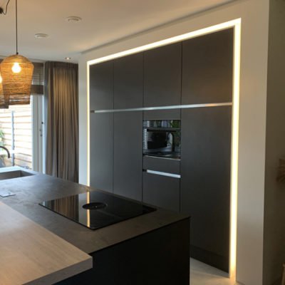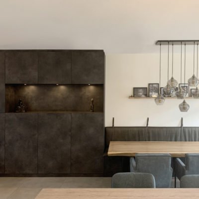 In de nieuwe inrichting is gekozen voor een royale maatwerkkast langs de lange wand, met sfeervolle nissen en geïntegreerde verlichting. Aansluitend is er een wandbank op maat ontworpen, afgewerkt met leren zit- en rugkussens. Alles is uitgevoerd in Decolegno panelen voor een warme, eigentijdse uitstraling.